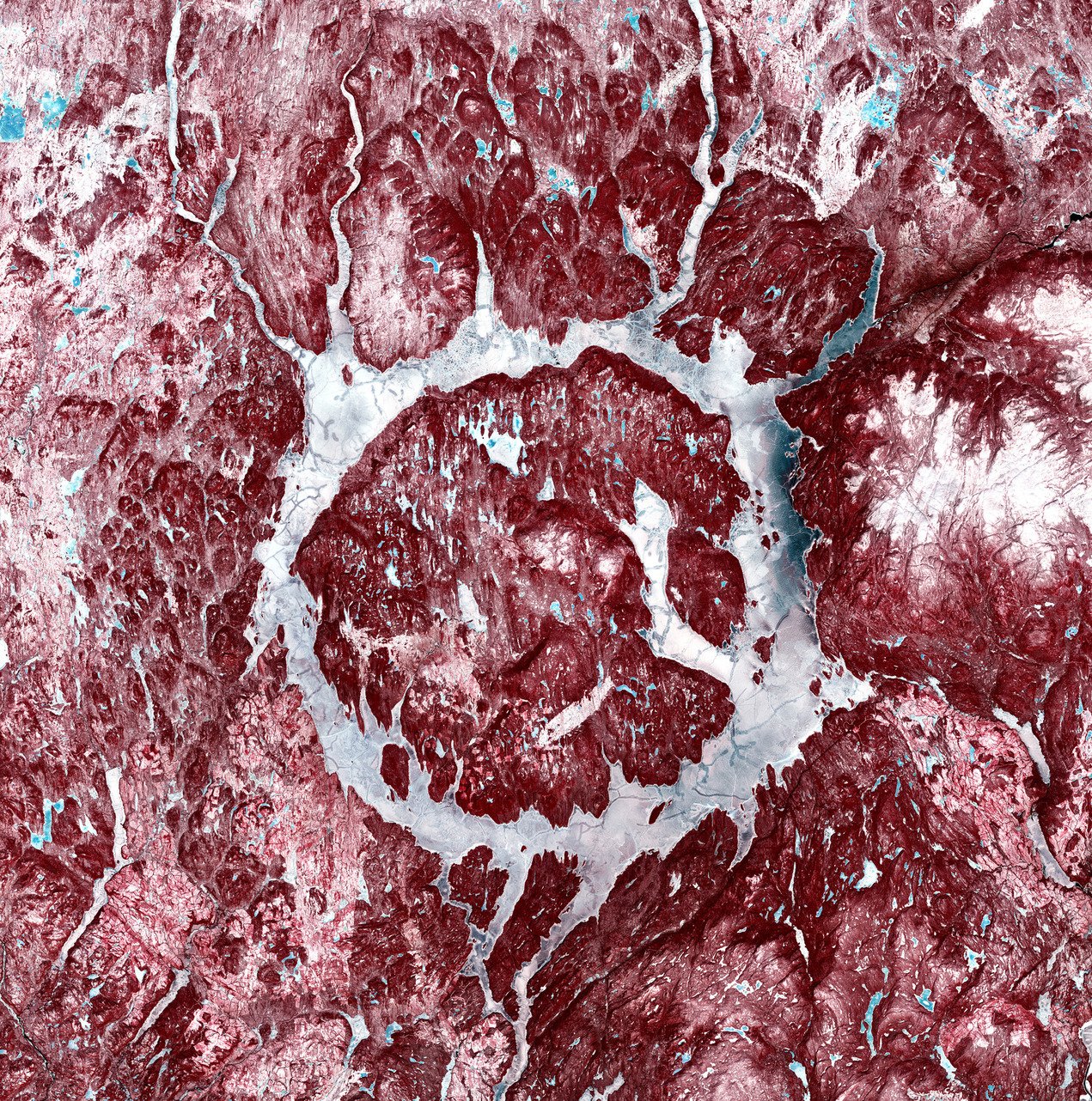 O “enfeite” em questão é, na verdade, a cratera Manicouagan, na província canadiana do Quebeque. Visível do espaço, esta estrutura circular foi formada pelo impacto de um asteróide gigante há cerca de 214 milhões de anos.