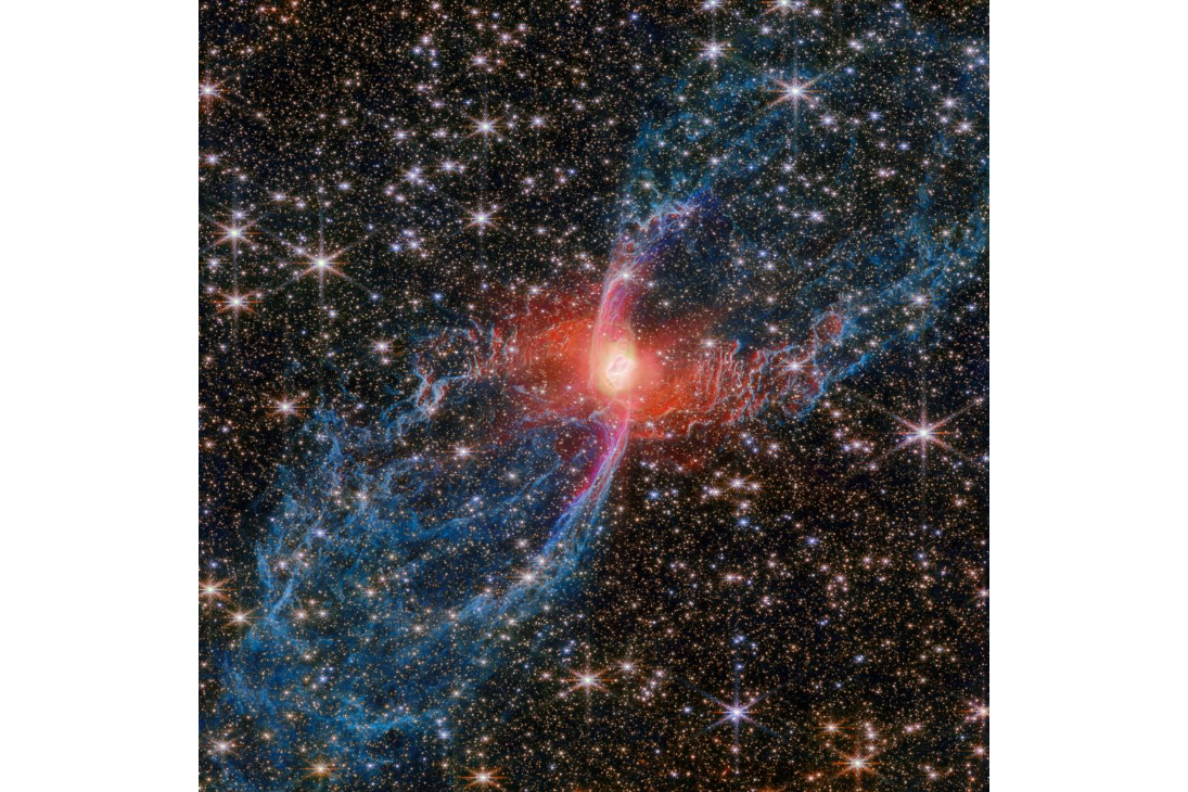 A estrela central da Nebulosa da Aranha Vermelha é visível nesta imagem, brilhando um pouco mais intensamente do que as teias de gás e poeira que a rodeiam. A natureza surpreendente da estrela central, extremamente quente e luminosa, da nebulosa foi revelada pela NIRCam do Webb. Nas imagens de comprimento de onda ótico, como as do Telescópio Espacial Hubble da NASA/ESA, a estrela apresenta-se fraca e azul. Mas nas imagens da NIRCam, aparece vermelha: graças à sua sensibilidade no infravermelho próximo, o Webb revelou uma camada de poeira quente a envolver a estrela central. Esta poeira quente orbita provavelmente a estrela central, formando um disco.