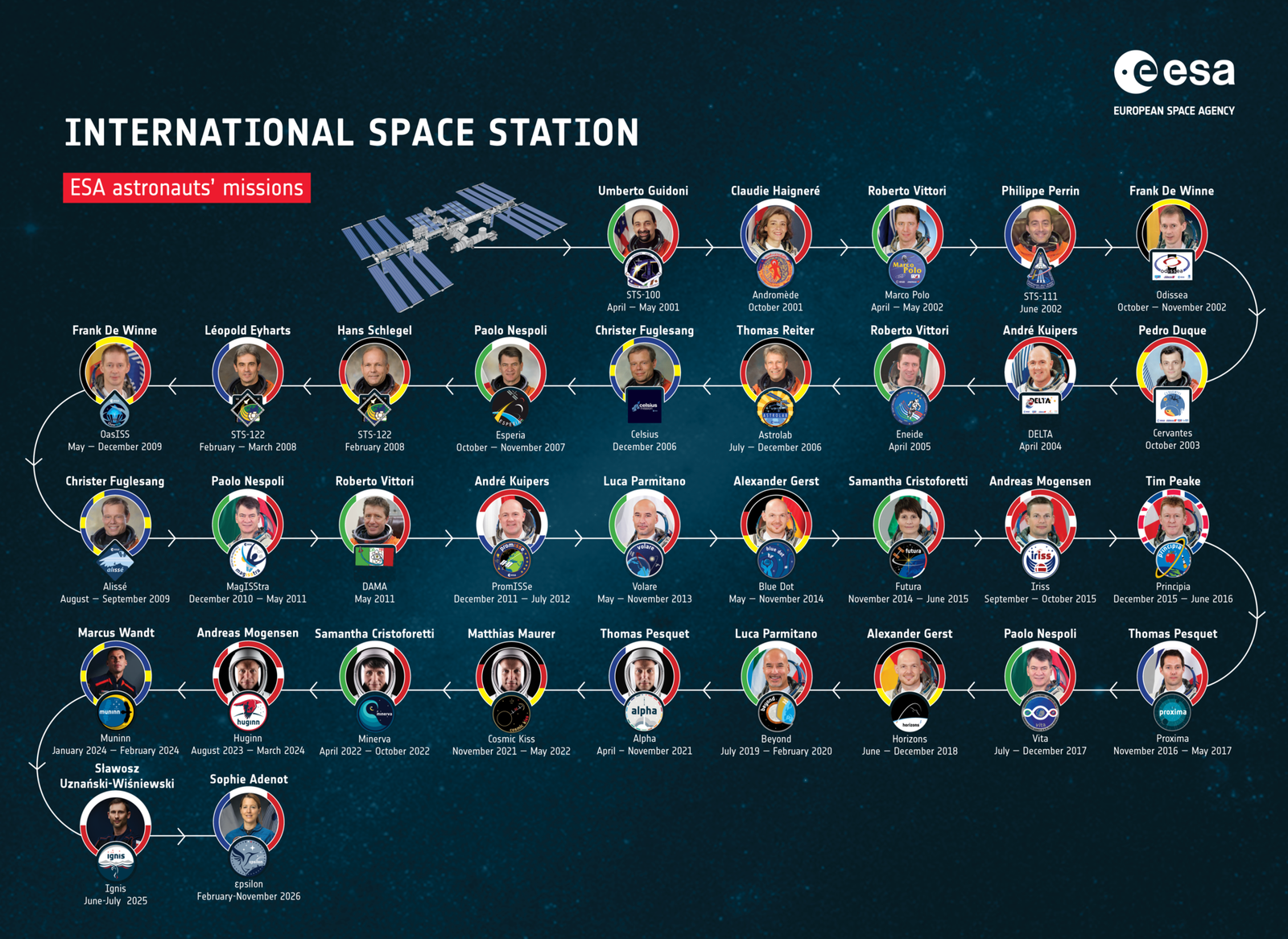 Infografia de todos os astronautas da ESA que serviram ou estão destacados para servir em missões à estação espacial internacional.