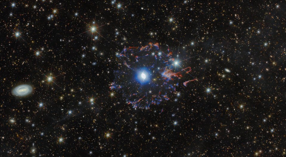 Este anel foi ejectado da estrela numa fase anterior, antes da formação da nebulosa principal no centro. Toda a nebulosa se destaca num cenário repleto de galáxias distantes, demonstrando como a beleza astrofísica local e os confins do cosmos podem ser vistos simultaneamente nos levantamentos astronómicos modernos.