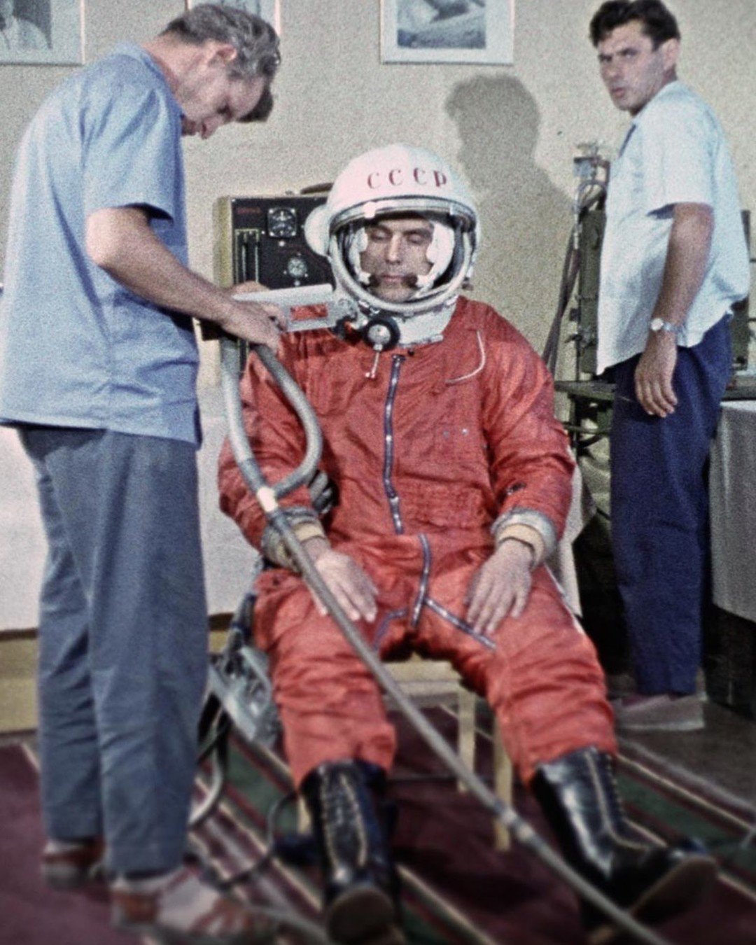 Vladimir Komarov envergando o fato espacial SK-1 durante os preparativos para o lançamento da Vostok-4 onde serviu como cosmonauta suplente. A Vostok-4 seria lançada a 12 de Agosto de 1962, sendo tripulada por Pavel Popovich.