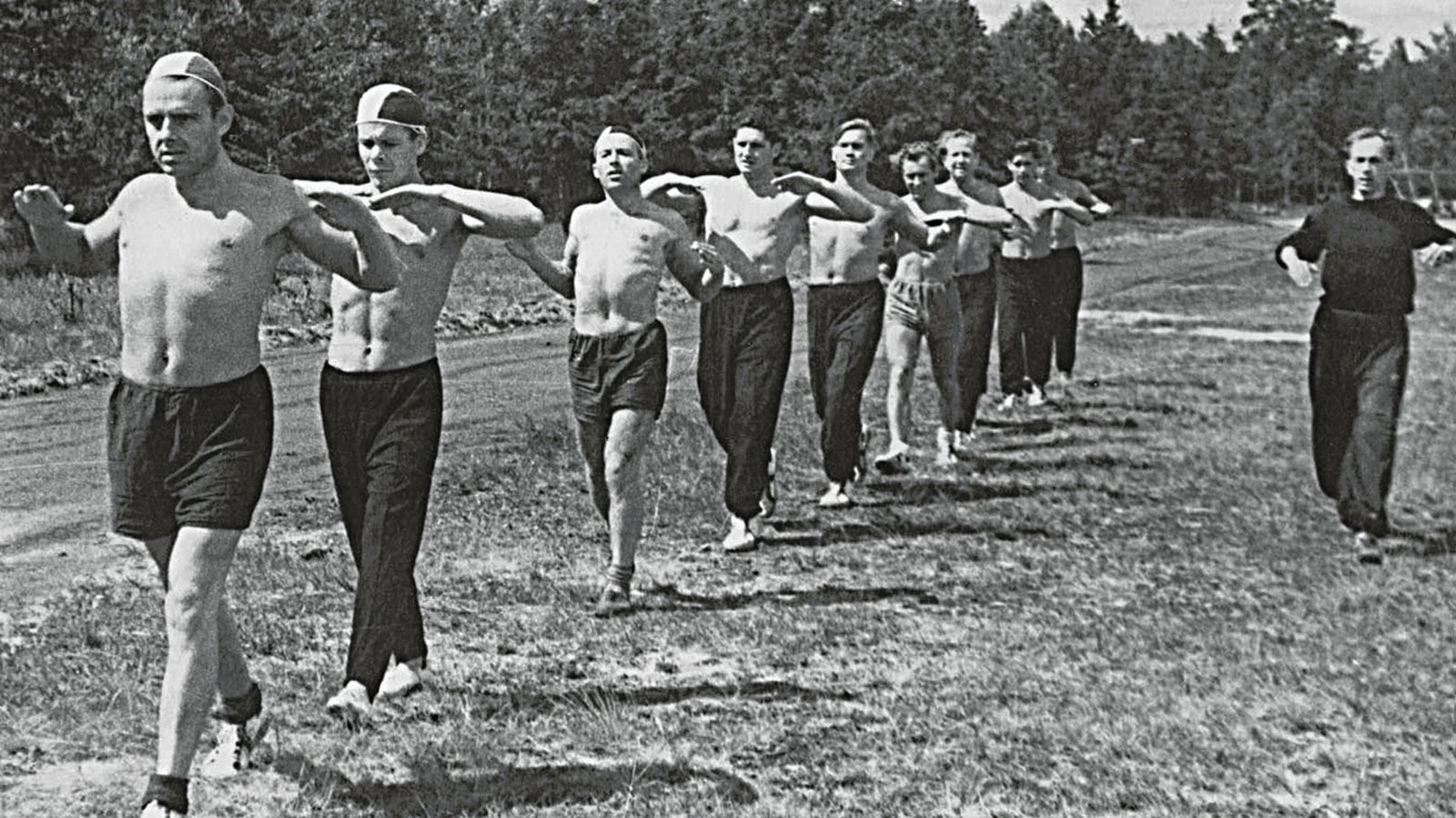 Membros do primeiro grupo de cosmonautas: Vladimir Komarov, Yegeni Khrunov, Ivan Anikeev, Boris Volynov, Valentin Filatyev, Gherman Titov, Alexei Leonov, Grigori Nelyubov e Georgi Shonin, realizam uma sessão de treino físico ao ar livre sobre a direcção do treinador Garaksky. A fotografia será datada de 1960-1961.