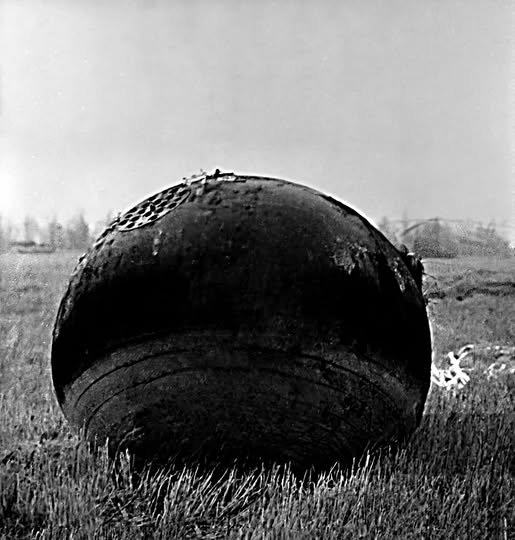 O módulo de descida do Cosmos-47, o veículo análogo não tripulado da cápsula espacial Voskhod, que transportou três manequins, após a sua aterragem a 7 de Outubro de 1964, perto da cidade de Kustanai, República Socialista Soviética do Cazaquistão.