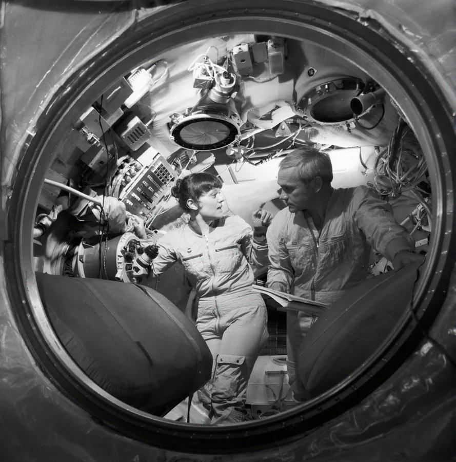 Svetlana Savitskaya e Vladimir Dzhanibekov são aqui fotografados durante uma sessão de treino no simulador da estação espacial Salyut-7 em 1984.