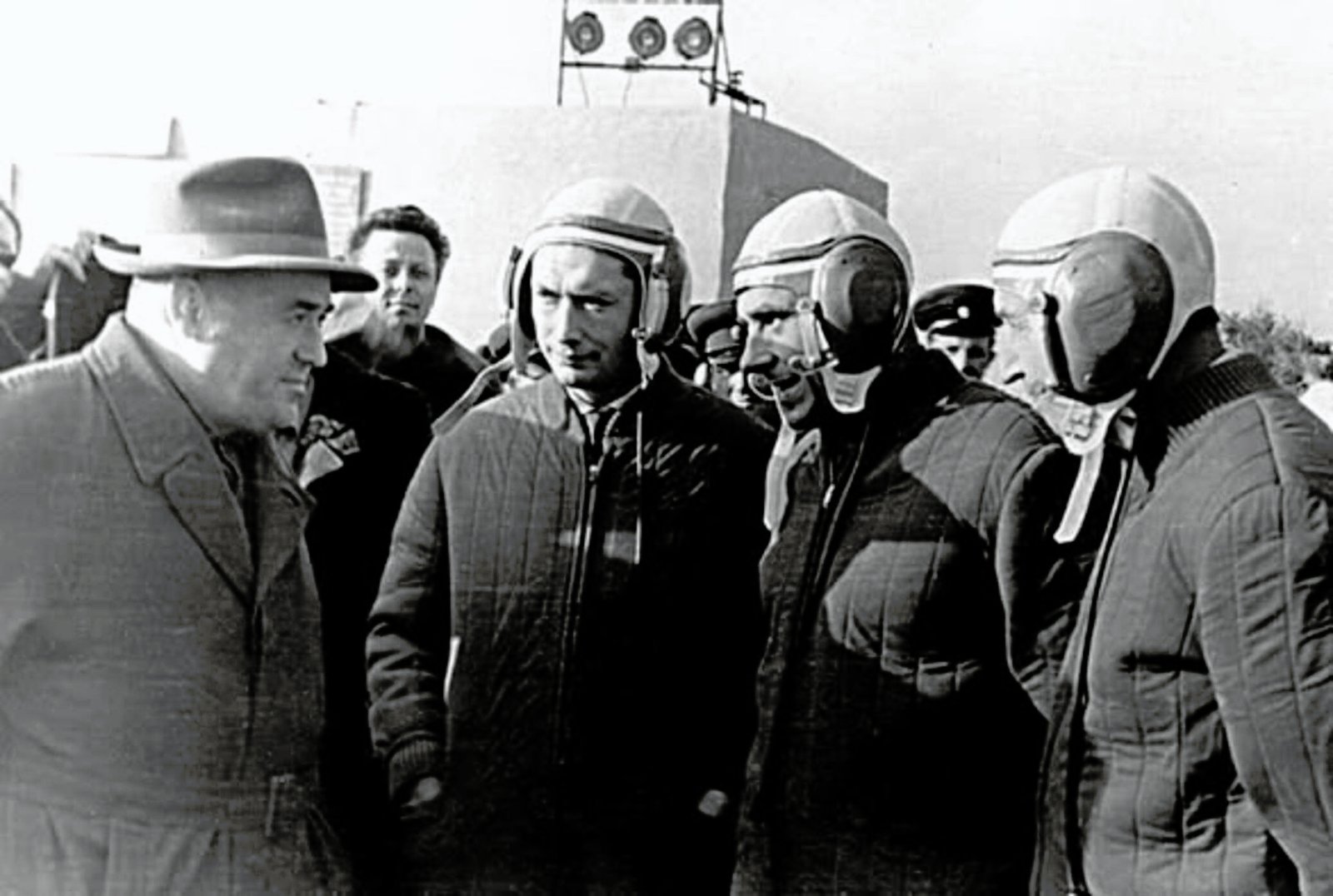 O Desenhador-chefe, Académico Sergei P. Korolev, chefe do OKB-1, no Cosmódromo de Baikonur com a tripulação da cápsula espacial Voskhod-1, a 12 de Outubro de 1964.