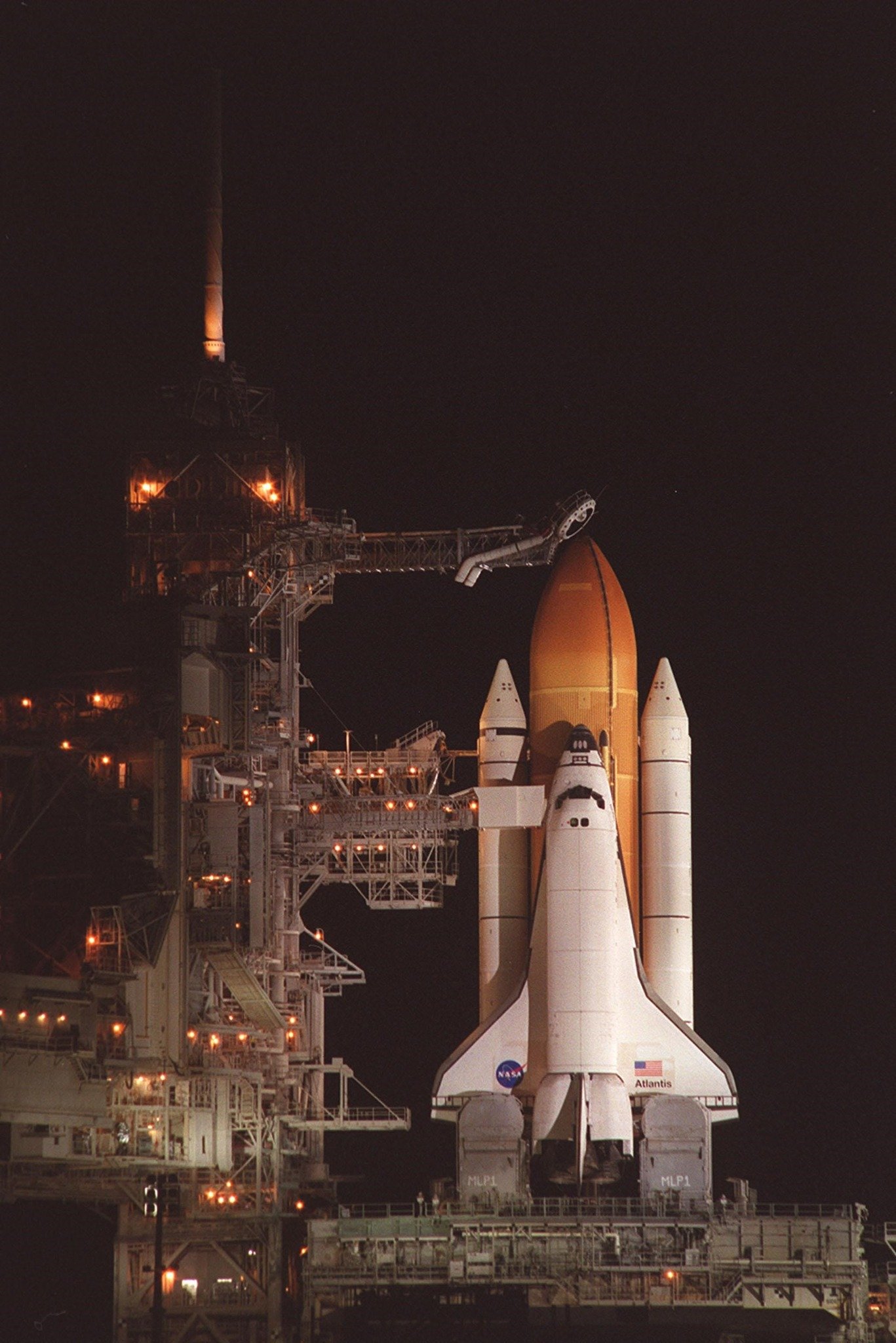 Após o recuo da Rotating Service Structure (à esquerda) na plataforma de lançamento 39A, o vaivém espacial OV-104 Atlantis exibe um aspeto impecável, banhado pela luz vinda de baixo.
