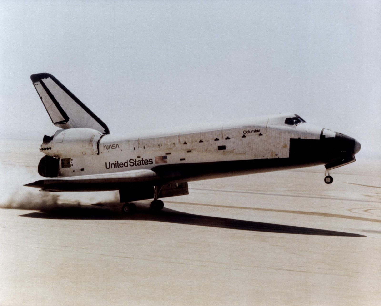 Tripulado por John Young e Robert Cripen, o vaivém espacial OV-102 Columbia aterra na Pista RW-23 da Base Aérea de Edwards, Califórnia, para finalizar o primeiro voo orbital de um vaivém espacial, a 14 de Abril de 1981.