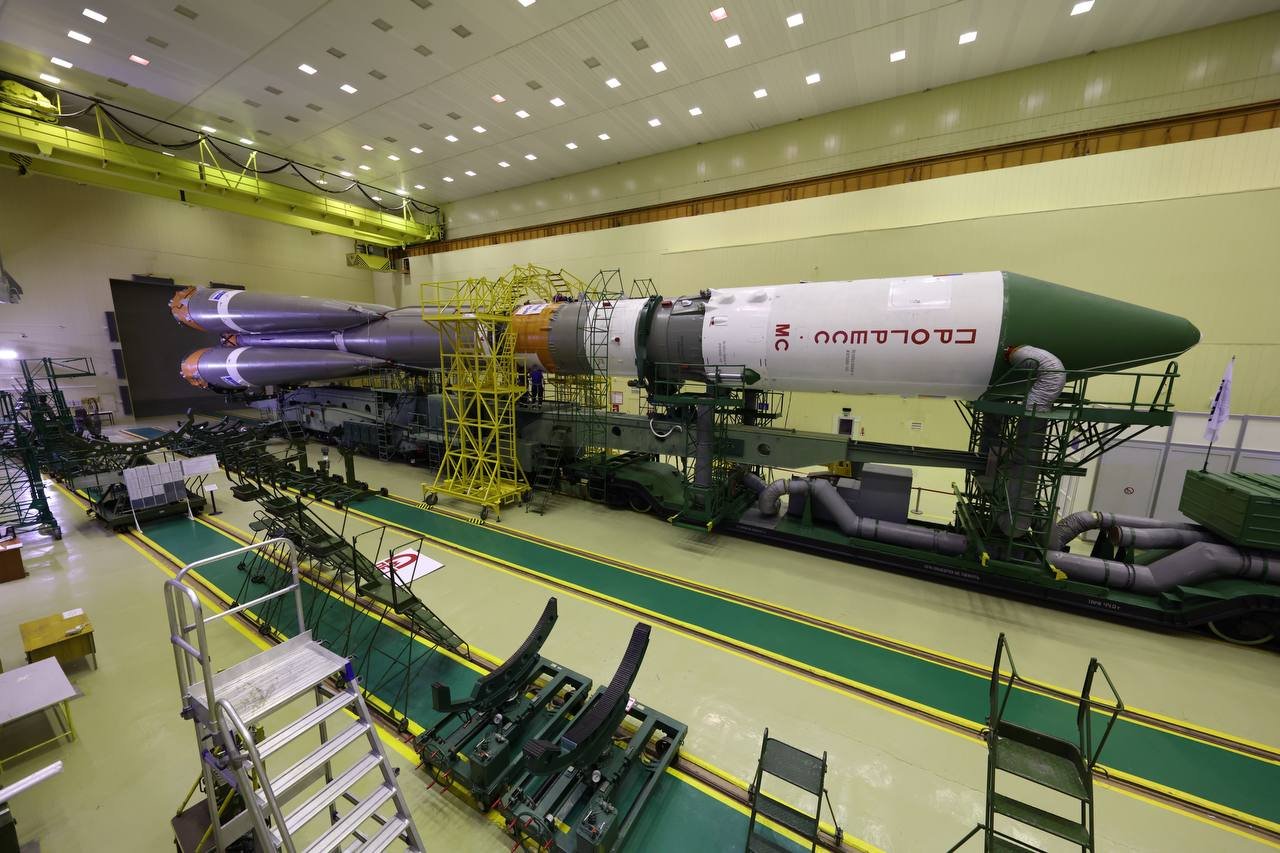 O processo inicia-se com a colocação em posição do terceiro estágio Blok-I e do Módulo Orbital, sendo estes dois elementos posteriormente acoplados. De seguida, este conjunto é elevado por um guindaste de grande capacidade e transportado lateralmente para a zona onde se encontram o primeiro (Blok-A) e o segundo estágio do lançador (Blok B, V, G e D). No topo do segundo estágio encontra-se uma estrutura em forma de grelha que serve de ligação com o Blok-I. Esta grelha permite a saída dos gases resultantes da ignição inicial do terceiro estágio enquanto se mantém ligado ao estágio central (Blok-A) durante o voo. Sendo colocado em posição na estrutura de transporte e elevação, o conjunto Blok-I / Módulo Orbital é então conectado com a grelha, finalizando assim a montagem do lançador. Após a finalização da montagem mecânica, seguiram-se as ligações eléctricas e realizaram-se os respectivos testes de integração. Estas operações foram finalizadas a 30 de Junho e no mesmo dia a Comissão Técnica autorizava o transporte do lançador para o complexo de lançamento.