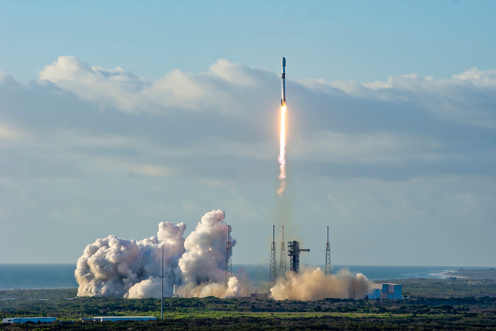Abandonando a plataforma de lançamento, o Falcon-9 inicia uma série de manobras para se colocar na trajectória de voo correcta.