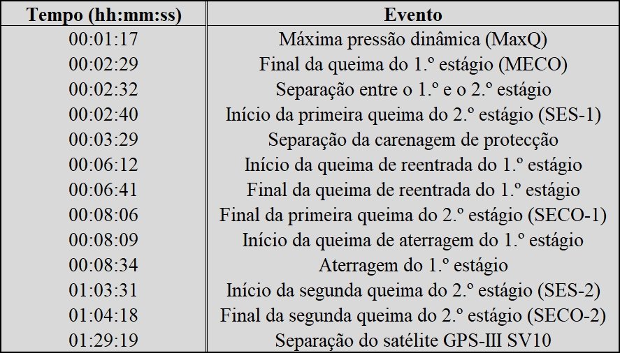 | 2026-087 | 631 | B1095.7 | CCSFS, SLC-40 | 21/Abr/26 06:53:25 | GPS-III SV10 | JRTI |