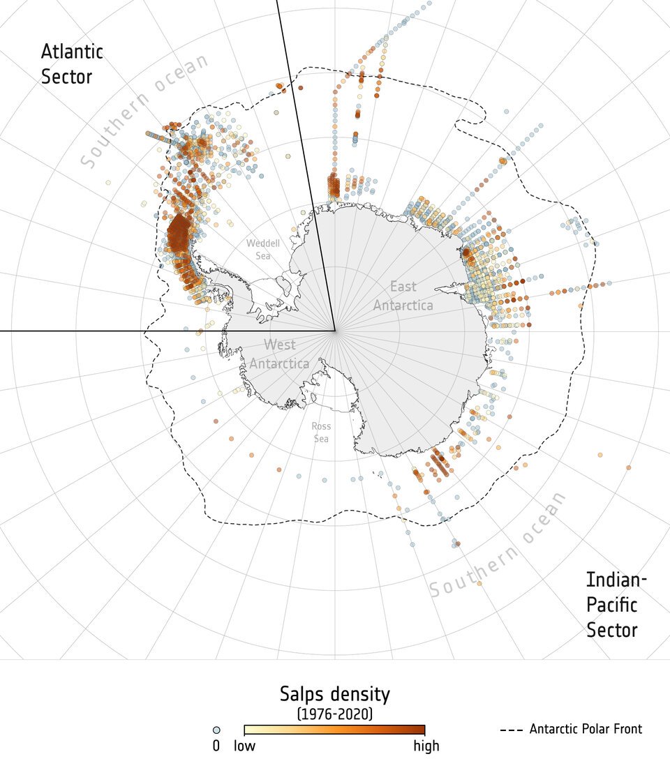 As salpas, organismos filtradores com uma estrutura gelatinosa, alternam entre a vida solitária e longas formações em cadeia que podem proliferar densamente. São também vitais para o ecossistema, prosperando frequentemente quando o krill está em declínio e potencialmente aumentando com as alterações climáticas. O estudo das salpas pode revelar alterações mais amplas que afetam o krill e o sistema marinho em geral.