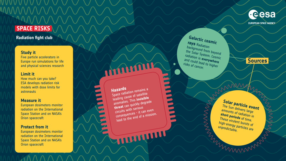 A caminho da Lua e de Marte, os astronautas enfrentam duas fontes principais de radiação espacial: os raios cósmicos galácticos e as partículas energéticas solares. Os primeiros têm origem em eventos energéticos para além do nosso Sistema Solar, como as supernovas; os segundos, em poderosas erupções solares.