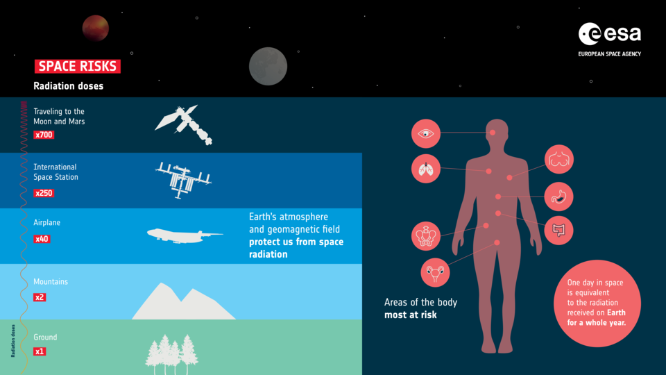 Para além do campo magnético protector da Terra, um astronauta em missão a Marte poderia ser exposto a doses de radiação dezenas de vezes superiores às do nosso planeta. O limite de radiação da ESA para a carreira de um astronauta é de 1000 milisieverts, a unidade que define a dose efectiva que pode causar danos no tecido humano. Doses mais elevadas, administradas por períodos curtos, representam riscos agudos, enquanto doses mais baixas contribuem principalmente para riscos para a saúde a longo prazo.