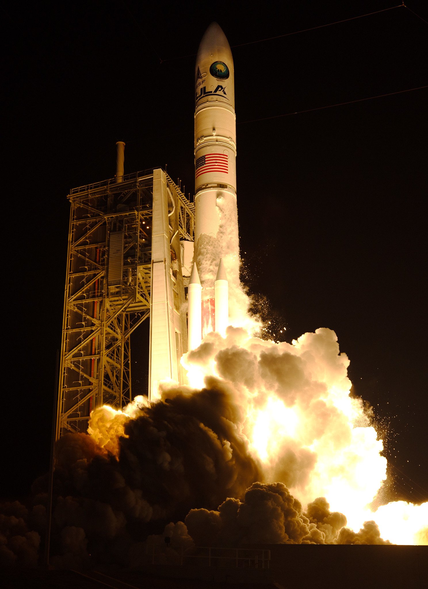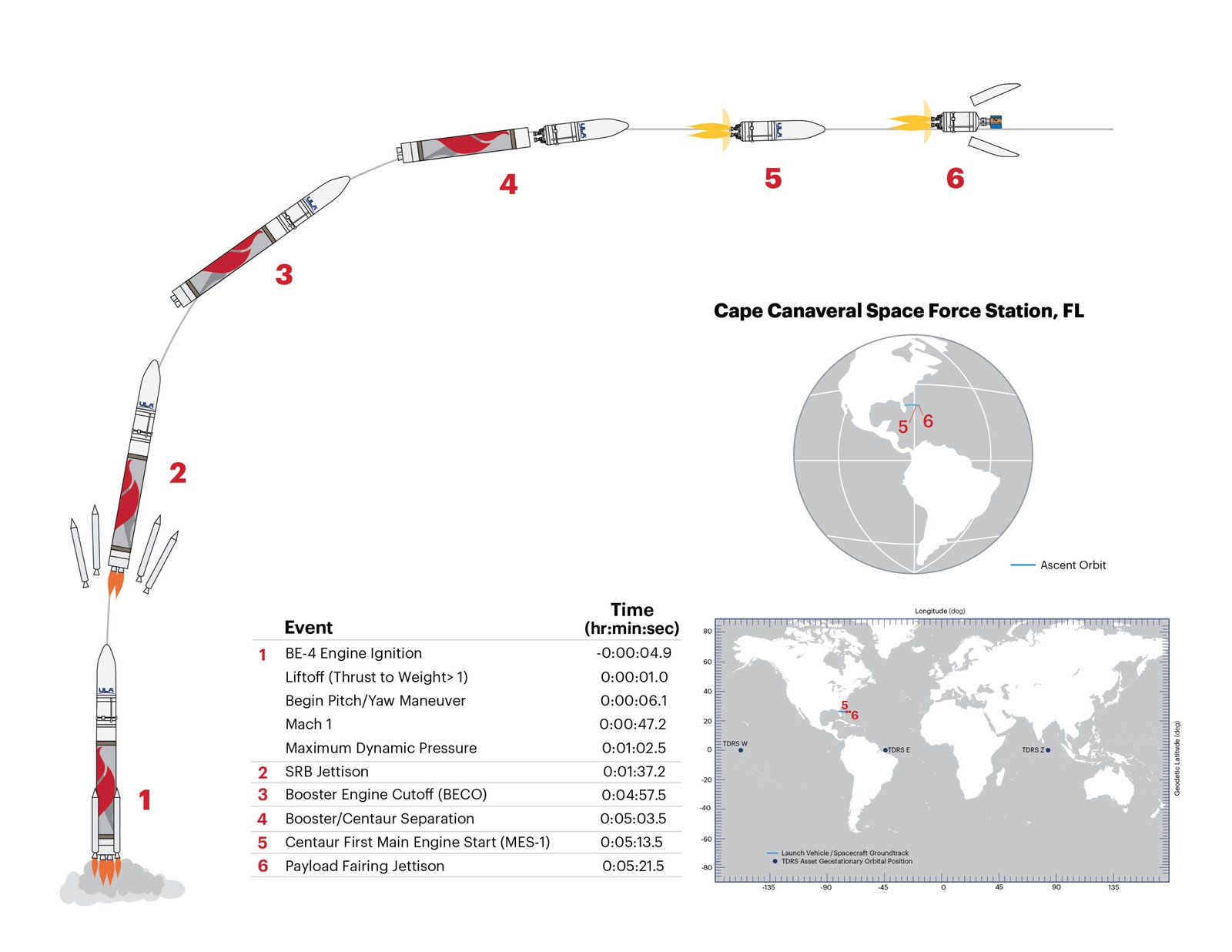 A separação dos propulsores laterais de combustível sólido ocorre a T+1m 37,2s (2). O final da queima do primeiro estágio (BECO Booster Engine Cut-Off) ocorre a T+4m 57,5s (3), seguindo-se a separação do estágio Centaur-V a T+5m 3,5s (4) e a sua primeira ignição (MES-1 Main Engine Start 1) a T+5m 13,5s (5). A separação da carenagem de protecção ocorria a T+5m 21,5s (6).
