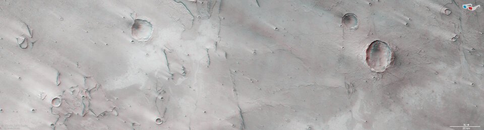 Outro exemplo de uma cratera em forma de borboleta, desta vez nas terras altas do Sul de Marte, é destacado nas imagens de Hesperia Planum obtidas pela Mars Express.