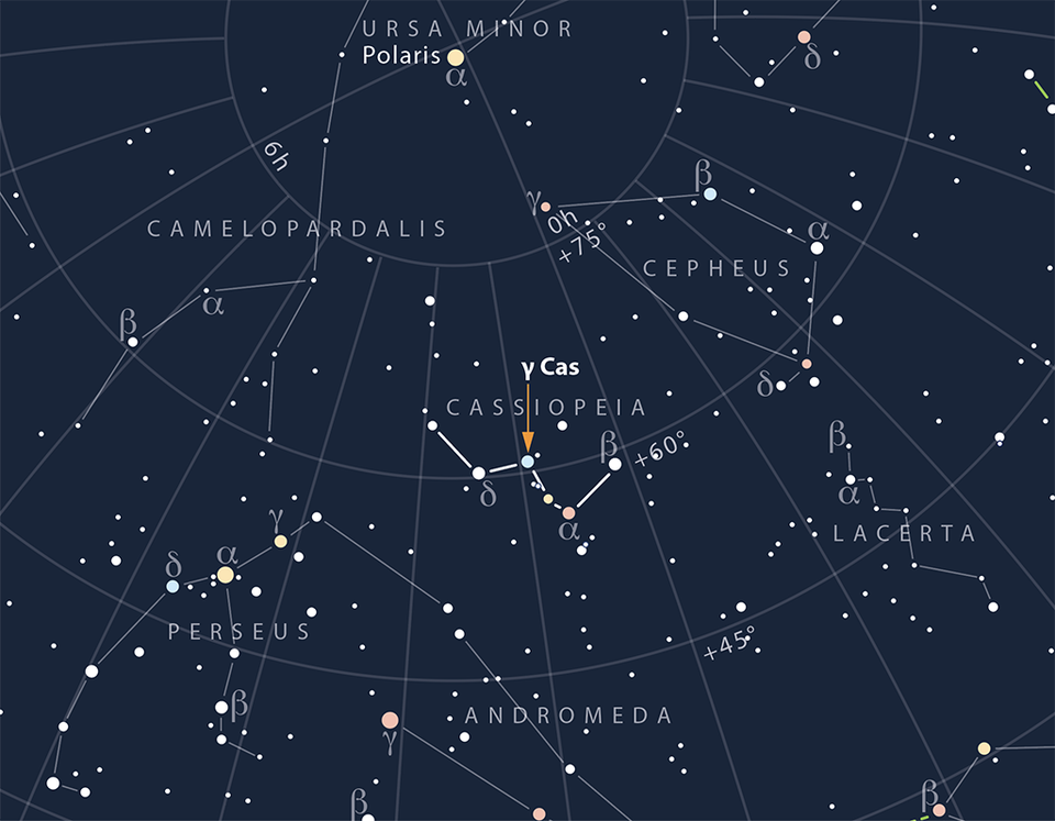 A estrela gama-Cas (γ-Cas) é visível para os europeus em todas as noites sem nuvens. Forma a ponta central da constelação de Cassiopeia, com o seu característico formato em “W”.